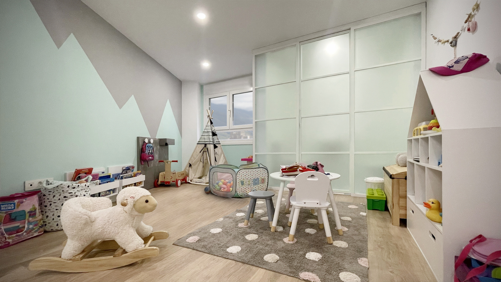 El despacho se presenta como un espacio incorporado a la zona de día, separado por unas cristaleras correderas que permiten el paso de la luz y vistas, y la posibilidad de incorporar este espacio a la zona de salón.
