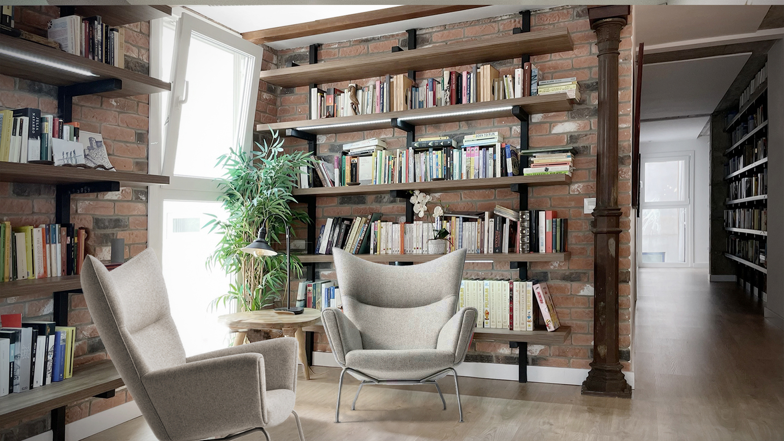 Para ello, se diseña un sistema de perfiles metálicos y baldas de madera retroiluminadas, de forma que se aprovecha los espacios de paso, despacho, biblioteca, etc. como pequeños oasis de lectura repartidos por la casa. La literatura es un factor predominante en cada rincón de la casa.