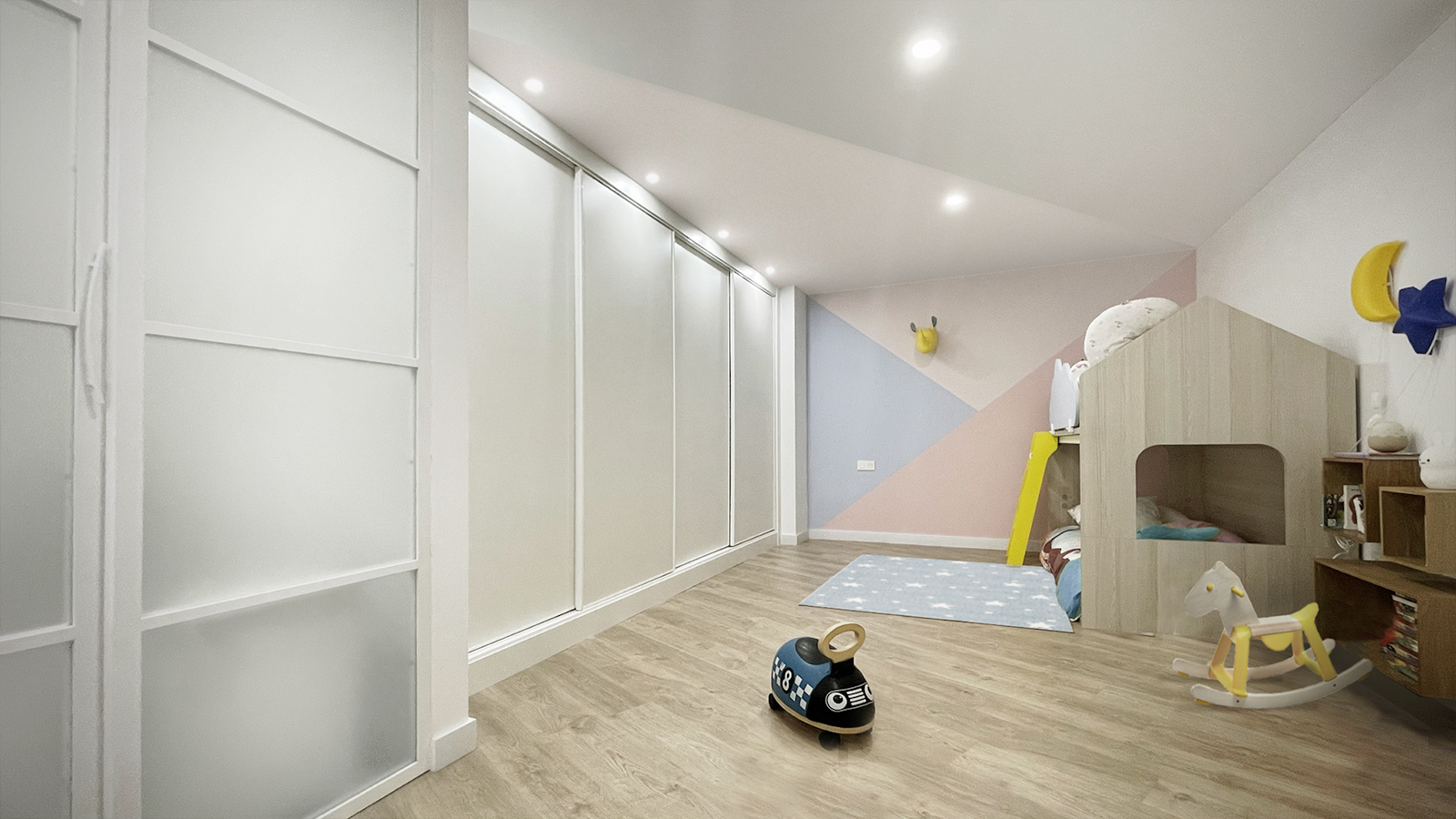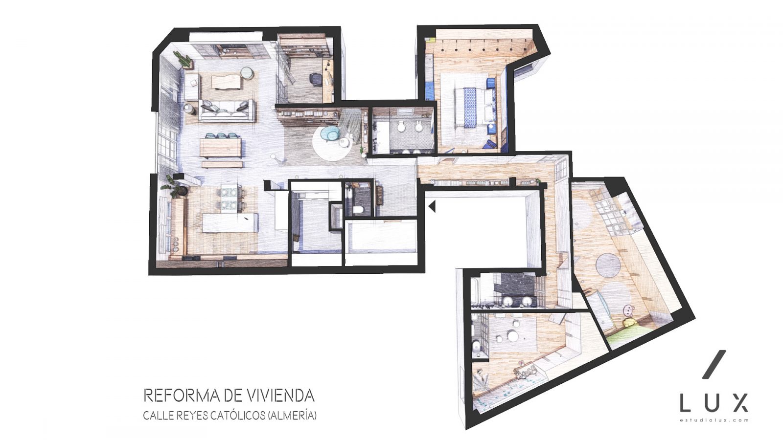 La reforma de esta vivienda, situada en pleno centro comercial de Almería, es fruto de la resolución de varios retos; la unión de dos viviendas independientes donde las instalaciones generales del edificio no coinciden con los nuevos usos de la nueva vivienda, y la conducción de las nuevas instalaciones sin perder la (ya escasa) altura de techos.