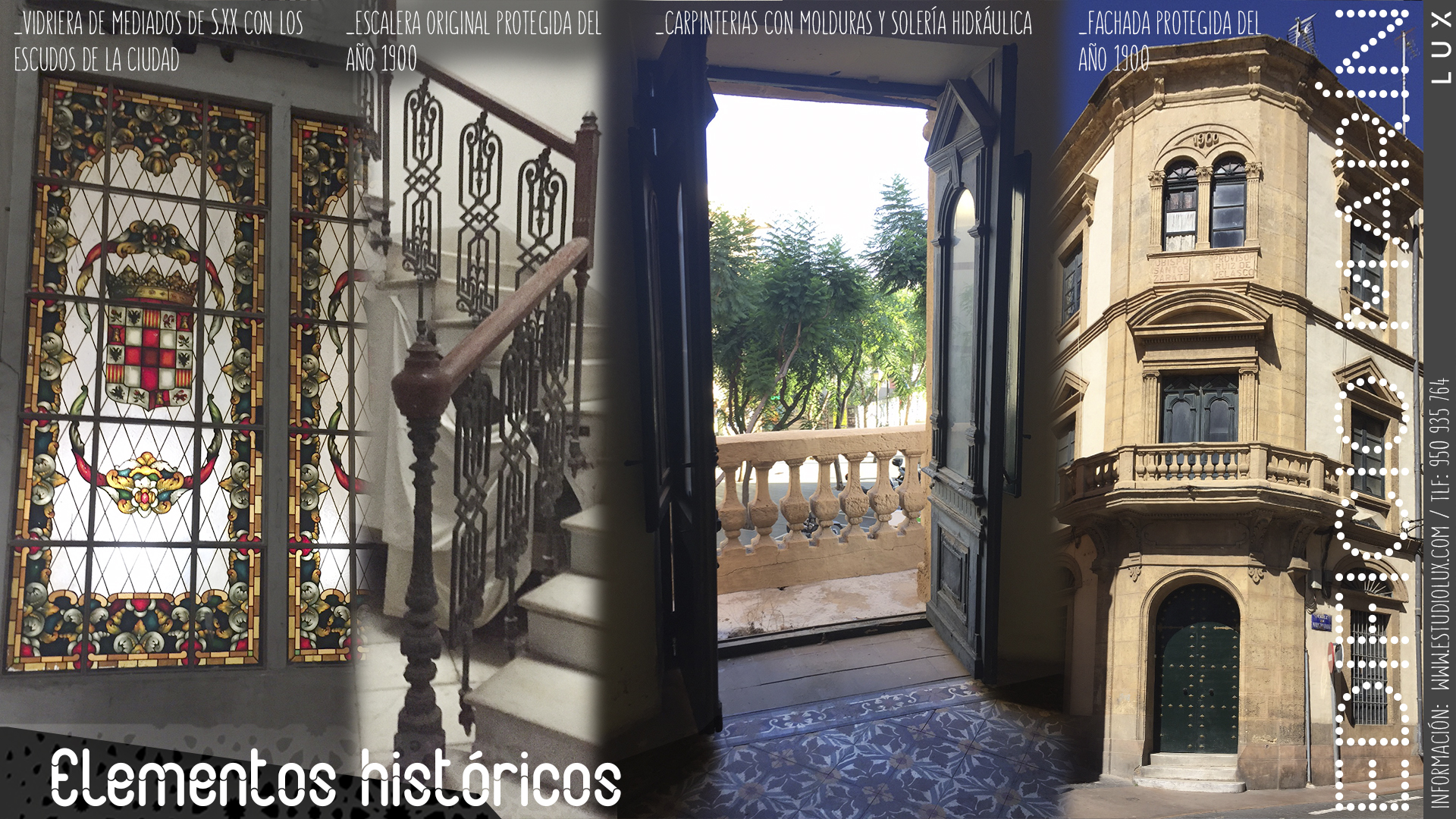 Nuestro equipo de arquitectos y decoradores han estudiado en profundidad cada detalle para sacar el máximo partido de este histórico edificio. Así, se tratan con cuidado y esmero espacios como el hall de acceso (catalogado patrimonialmente) con sus grandes puertas ricamente labradas, la escalera central de marmol y su cerrajería ornamental (también protegidas). En el lucernario de la escalera (catalogado), se recuperan las magnificas vidrieras con el escudo de la ciudad, creando una bonita atmósfera de luz y color en el acceso a cubierta.