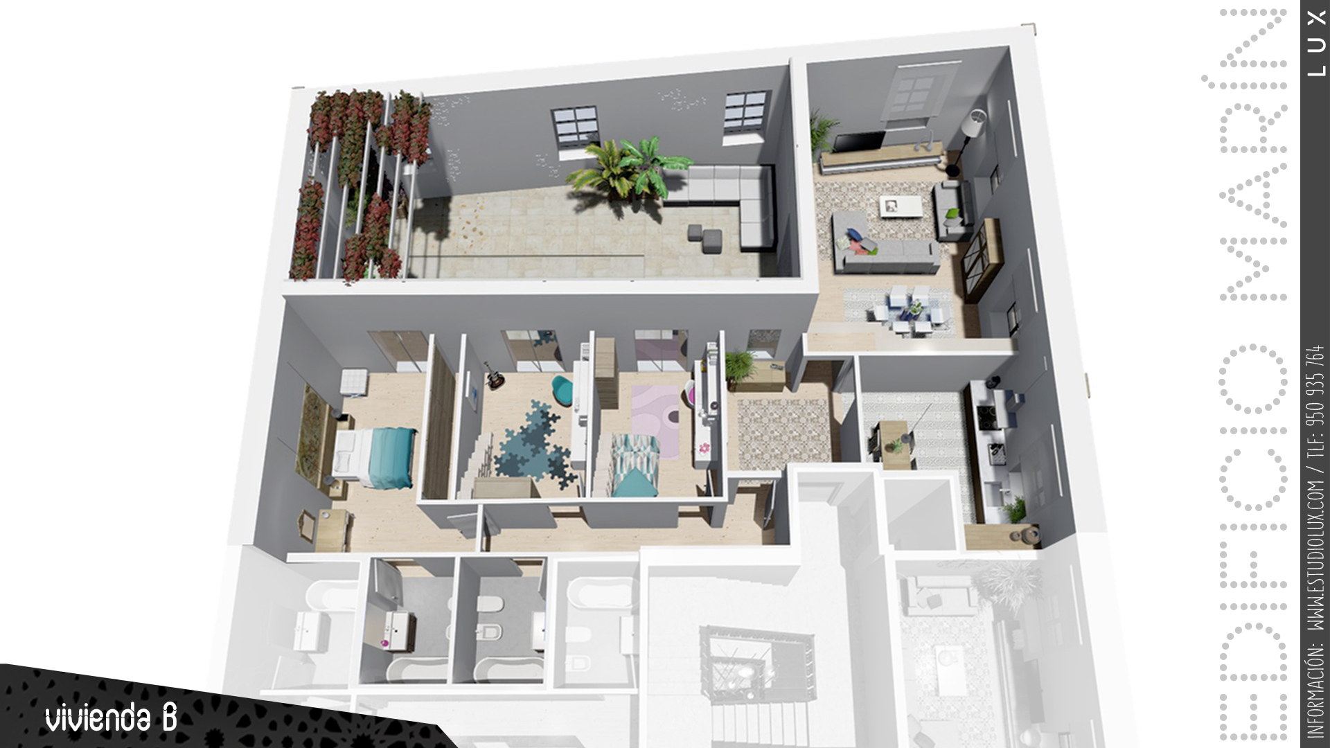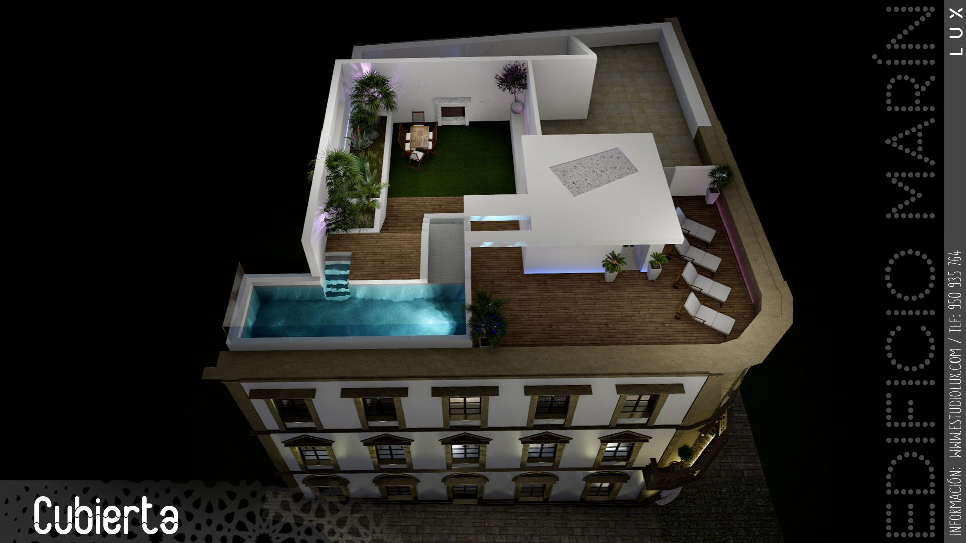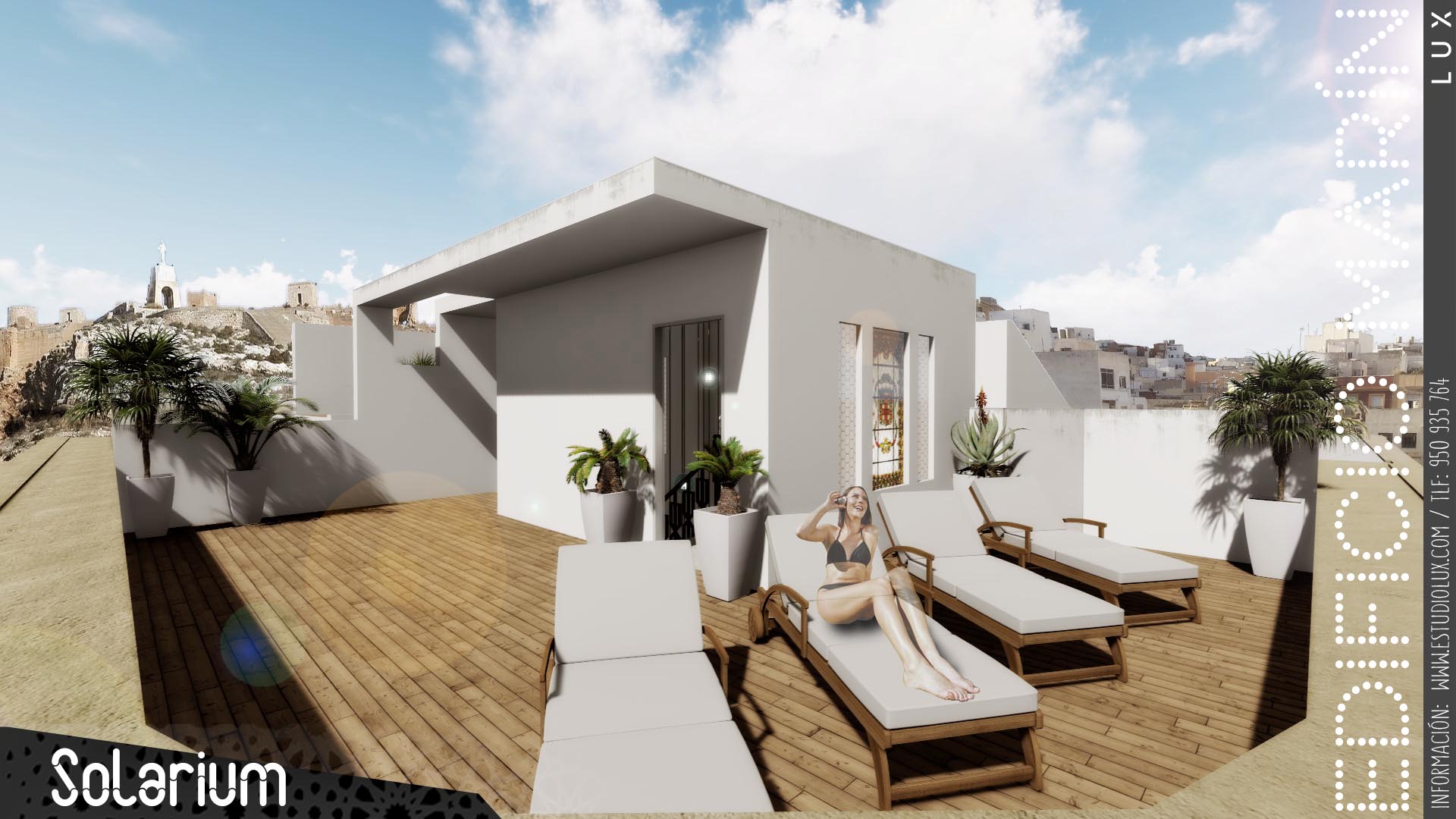 Ya en la cubierta, se podrá disfrutrar de un auténtico mirador privilegiado con vistas a la ciudad, Plaza del Monte, Murallas de Jairán, Sagrado Corazón de Jesús y la Sierra de Gádor. Un lugar de esparcimiento para disfrutar del solarium, piscina y zona ajardinada.