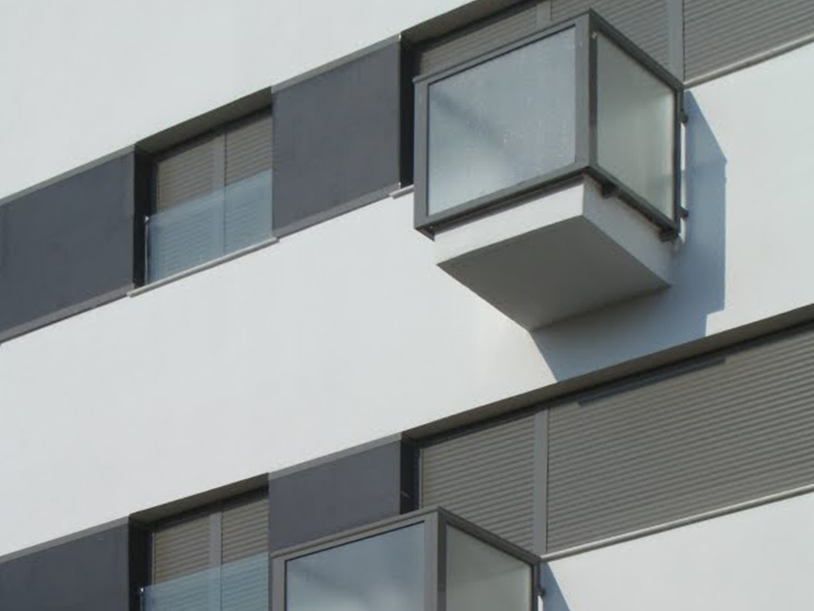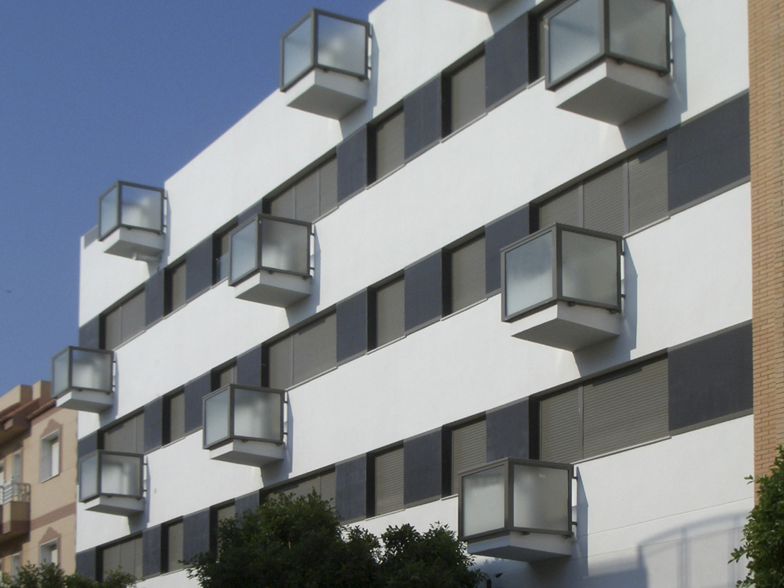 Edificio plurifamiliar de viviendas en altura, en el núcleo urbano de Santa María del Águila (El Ejido). La fachada juega con los volúmenes de las terrazas, para aportar volumetría al orden edificatorio.