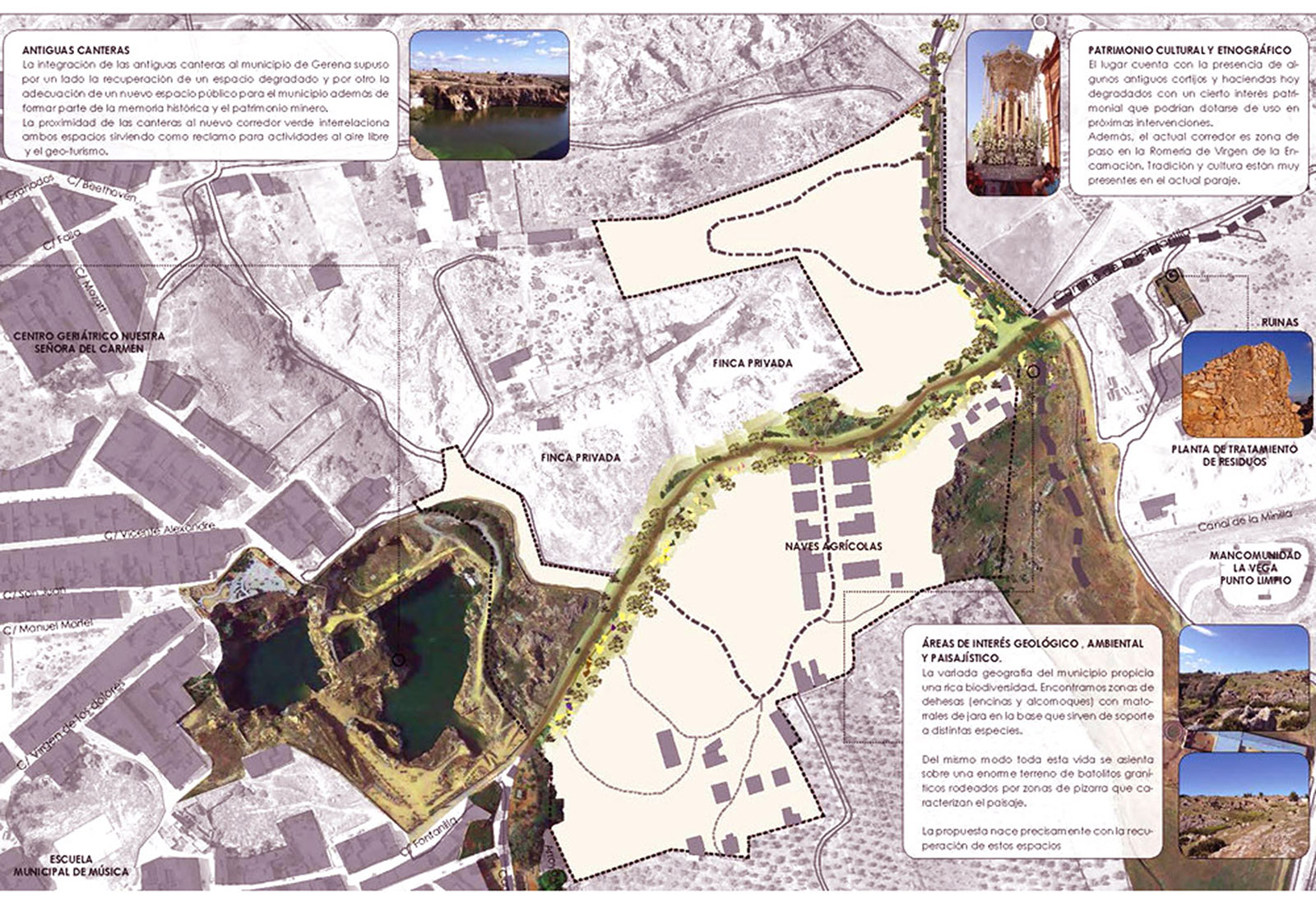 - Recuperar una zona degradada del entorno del municipio de Gerena para potenciar el desarrollo de actividades de educación ambiental, ecoturismo, turismo sostenible y turismo cultural.