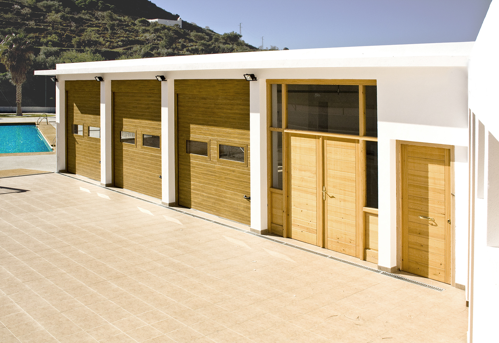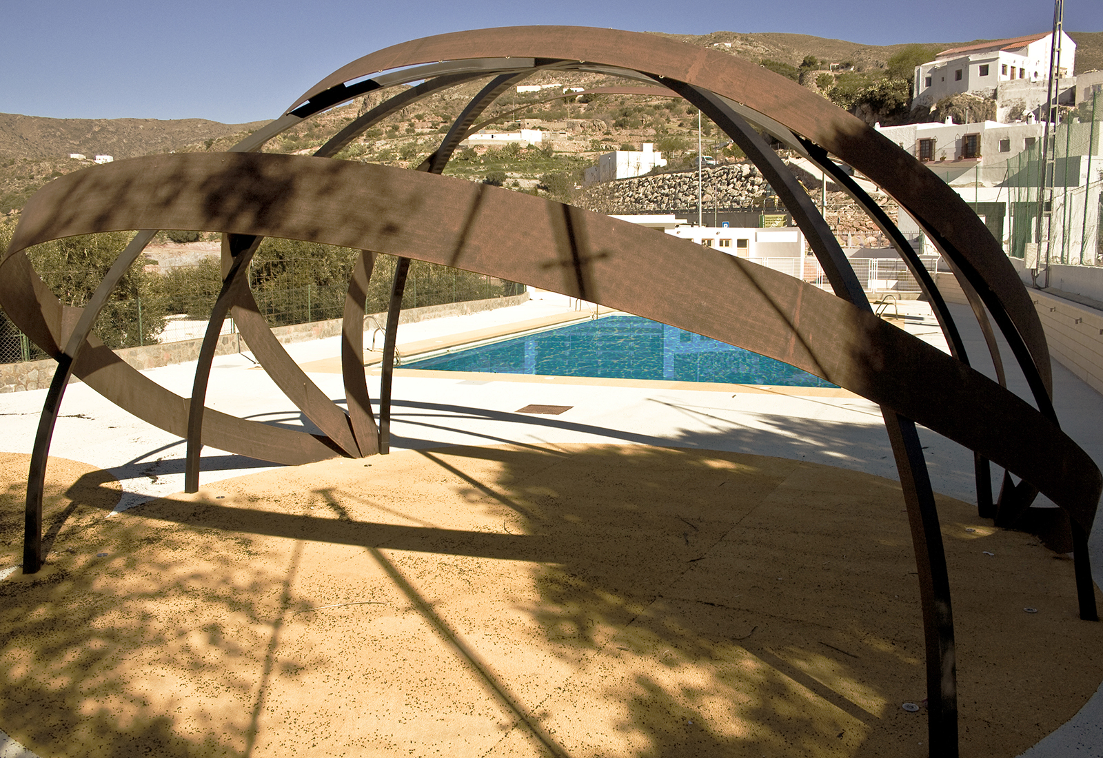 Intervención de rehabilitación en las instalaciones municipales de Felix (Almería). El programa exigía zonas de sombra y recuperación de una zona de restauración, con posibilidad de apertura fuera de horario de piscina.